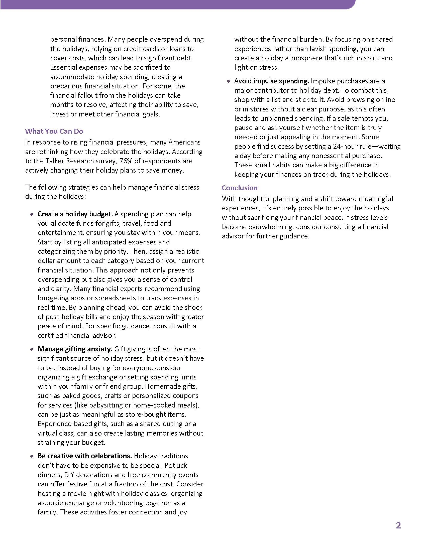 The holiday season is often considered a time of joy, generosity and togetherness. But for many Americans, it also brings a heavy dose of financial stress. Between giftgiving, travel, festive meals and social obligations, the pressure to spend can quickly spiral out of control. As the holiday season approaches, it’s more important than ever to understand the roots of financial stress and adopt effective strategies to manage it.